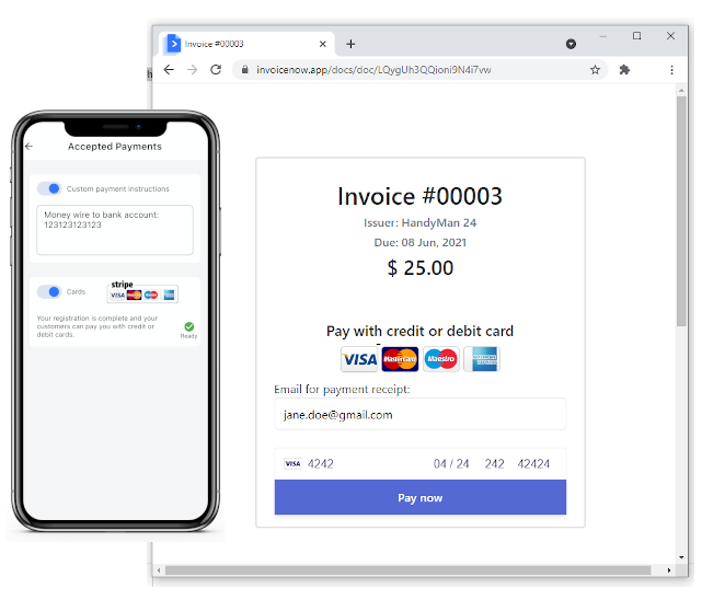 We have partnered with Stripe in order to allow you to accept Credit and Debit cards. This gives additional payment options for your customers and increases the chances that you get paid on time.